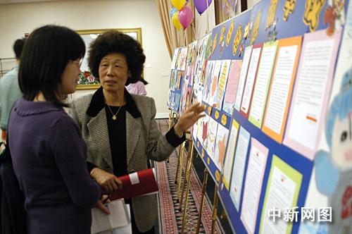 现任阳光学校校长、中国驻美大使周文重夫人谢淑敏女士(右)告诉记者,驻美使馆阳光学校在中文教学之外为孩子们组织丰富多彩的活动,增强了孩子们学习中文的兴趣。(中新社/邱江波)
