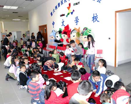 据意大利《欧联时报》报道,在北京奥运会迎来倒计时100天之际,当地时间4月29日,意大利普拉托华侨华人联谊会中文学校师生举行同心迎奥运庆祝活动,联谊会第一副会长郑贤杰、常务副会长吴瑞康和400多名中文学校师生欢聚一堂,共同表达对2008北京奥运胜利举办的衷心祝愿。
