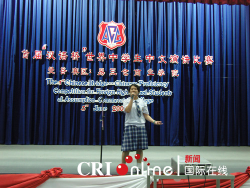 在才艺表演环节中,选手们更是“八仙过海,各显神通。”诗朗诵、唱中文歌、讲故事、笛子演奏、画中国画等,充分显示了选手们对中华文化的热爱。来自易三仓商业学院的选手黄泽莉在才艺表演中演唱了“承诺”这首新歌。“为了你我再苦也不躲,我要你重获原来的生活……”在黄泽莉悠扬的歌声中,一个个在四川地震中发生的温馨场景通过幻灯片一一展示,现场观众无不为之动容。17岁的泽莉是华裔,从小就在父母的指导下学习汉语,四川地震发生后,她上网查找了这首最新的歌曲,并查找了相关的照片。她说:“我虽然在泰国出生,但我身上流淌的是中华民族的血液,希望通过这次比赛,告诉更多的朋友,我们爱汉语,更爱中国!”。