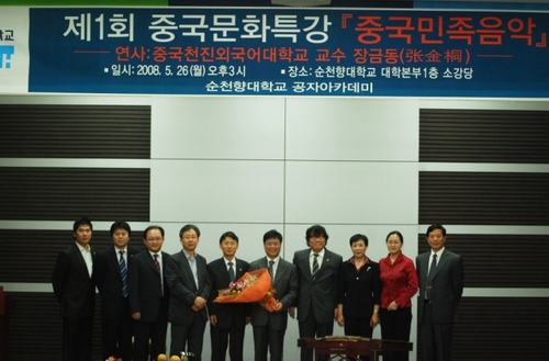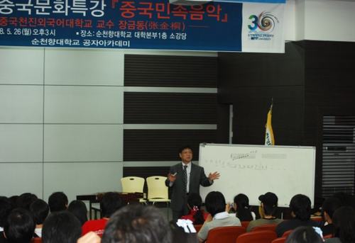 近日, 韩国顺天乡大学孔子学院迎来了期盼已久的第一届文化讲座,此次文化讲座以中国民族音乐讲解、演奏为主题。韩国顺天乡大学副校长孙丰三、天津外国语学院党委书记刘翠娥等出席了本次音乐演讲会。天津外国语学院国际交流处处长张金桐教授向观众详细讲解了中国民乐,并当场演示了葫芦丝、竹笛、塤、扬琴、二胡及快板等。
