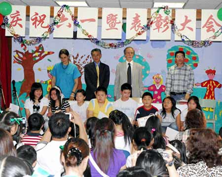 演出前,顾宏林总领事首先代表总领馆祝小朋友们节日的快乐,并感谢小朋友们把自己的零用钱无私的献给了灾区儿童。顾宏林说,2008年的中国,荣耀与灾难交融,四川大地震夺去了我们很多同胞的生命,北京奥运燃起了中华民族的希望。相信有全中国人民的共同努力,有海外华人的无私援助,中华民族一定能够战胜困难,成功举办奥运会。