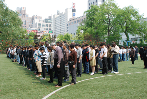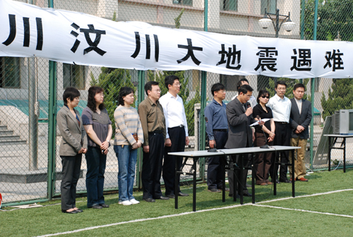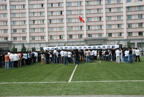 5月19日,是全国第一个哀悼日。下午2点,北京华文学院全体教职员工、以及来自世界39个国家和地区的留学生、教育部官员、华校校长等400余人,聚集在操场上,举行为四川汶川大地震遇难同胞默哀仪式。