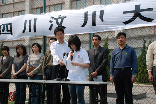 学院长期班学生,来自印尼的傅莲妮同学代表全体华裔留学生讲话,向四川汶川大地震中遇难的中国同胞致哀。她还回忆起去年在四川游教时,在绵阳下车,途经汶川等地参观时的情景,回忆起当地亲切热情的四川人……她的讲话饱含着海外华裔青少年学生对祖籍国人民的真挚情感,令在场的人们动容,很多留学生泣不成声。