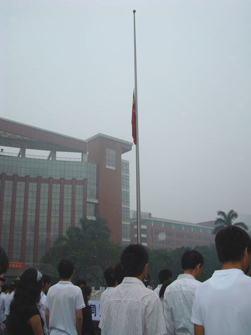 国务院公告发布后,暨南师生早早就行动起来,5月19日清晨6点45分,学校在图书馆广场举行降半旗仪式,为四川汶川地震遇难者致哀。数百名暨南师生怀着悲痛的心情,冒雨参加了仪式。