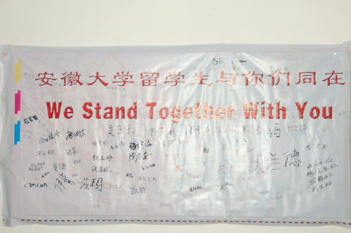19日上午9点半,留学生志愿者们在学院大厅内挂起了题为“安徽大学留学生与你们同在”的横幅并摆放了自制的“爱心”募捐箱。课间休息时,同学们纷纷拿起笔在横幅上签下自己的姓名和慰问的话语,并为灾区人民捐款,表达爱心。