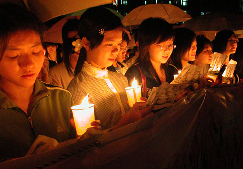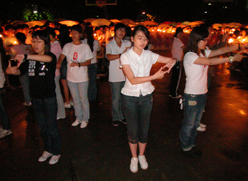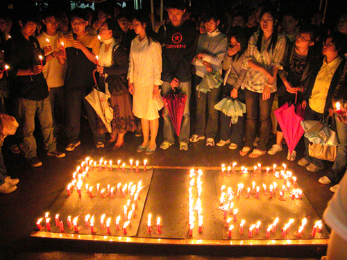 在七号篮球场,围绕着烛光拼成的“5.12”图案,上千名同学里三层外三层围成同心圆,共同为死难者默哀,为生者祈祷。