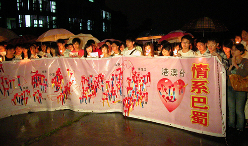 温馨的祈福现场,广大同学齐声同唱《祈祷》、《让世界充满爱》等歌曲,“四川同学,我们爱你们!”、“四川同学,我们永远支持你们!”、“中国加油!四川加油!”、“中国万岁!四川雄起!”的口号声此起彼伏,表达着大家对灾区和祖国的美好祝愿与期盼。
