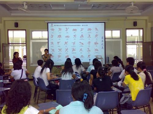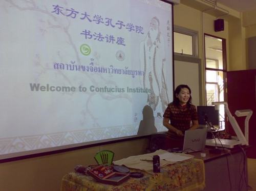 东方大学孔子学院院长符丽珠博士主持了开班仪式。她首先对学员们的到来表示热烈欢迎,并向学员们介绍了孔子学院的宗旨、工作任务、泰国东方大学的汉语培训计划及中泰文化交流项目。孔子学院汉语教师王洁曼老师为学员们做了精彩的书法讲座。她向学员们介绍了文房四宝、书法发展简史,并现场示范书写毛笔字。中国书法的博大精深令学员们赞叹不已,纷纷提笔跃跃欲试,讲座现场气氛热烈。