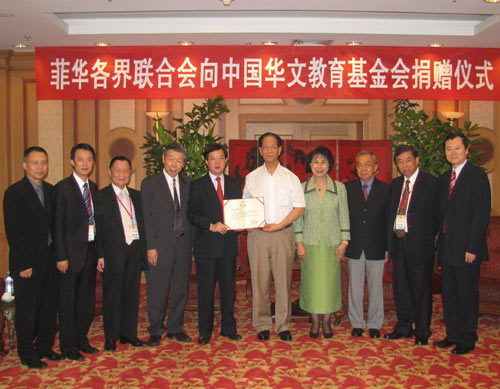 6月25日晚,菲律宾菲华各界联合会访华团向中国华文教育基金会捐赠50万元的捐赠仪式在北京新世纪日航饭店浙江厅举行。菲华各界联合会名誉主席蔡友铁、林玉燕,执行主席戴宏达、执行委员黄锡堃、许中荣、黄华鸿和常务委员卢祖蔭代表访华团出席捐赠仪式。