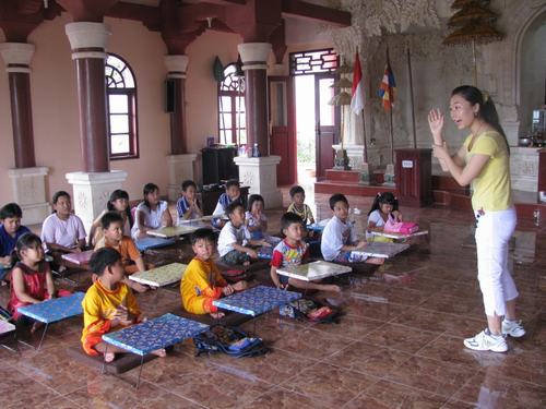 汉语补习班的学生最小的只有5岁,最大的也只有十几岁。上课是在一个佛堂,没有真正意义的教室,没有黑板,条件清苦,但是一张张纯真的笑脸,几十个学中文的小学生渴望汲取知识的眼睛,让在场的老师深深感动。老师们发挥所能,采用了比较活跃、生动的唱儿歌、做游戏等课堂形式,让孩子们在自然轻松的气氛下,接触到更多的汉语知识。每一个学生与老师形成良好互动,提问时表现得积极踊跃,因此,老师们能在停留的有限时间尽情为学生们讲解更多的知识。
