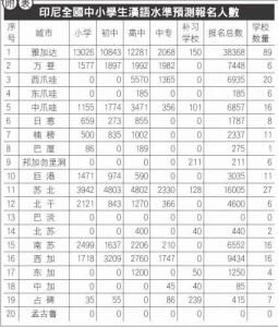 2008年底,中国国家汉办主办、印尼HSK汉考委员会与雅加达华文教育协调机构承办了一次大范围的初级汉语水准预测,印尼全国18个省254所学校的10万多名学生报名参加考试(见上图)。由于技术问题实际参加考试的学校共233所,人数80574人。