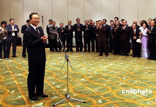刚下榻酒店,温家宝就不顾疲劳地赶到会议厅接见汉语教师志愿者、使馆工作人员、侨领及中资机构代表。在与大家合影留念后,温家宝发表了讲话,他介绍了中国国内经济、政治形势等情况,并鼓舞在泰的华人华侨保持并传递振兴经济的信心,与泰国、与本地区的人民一起努力,为本地区的繁荣与稳定作进一步贡献。