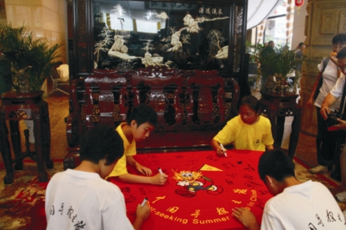 参加“中国寻根西安之旅夏令营”的营员们在会旗上签字