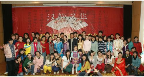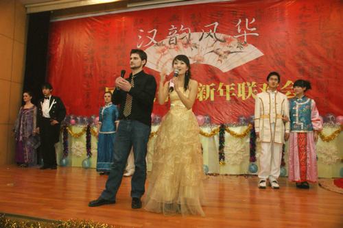 2007级对外汉语专业的学生带来的《shining kiss》拉开了新年联欢会的序幕。活力青春、古灵精怪的动感舞姿,瞬时吸引了全场观众的目光。颇具创意的歌舞剧《罗密欧与林黛玉的爱情奏鸣曲》,既跨越了历史时空,又拉近了中西文化的距离。妙语连珠的相声,极具风雅的古诗文配乐朗诵、中外硕士研究生用歌舞演绎的《中国话》以及有“钢琴王子”之称的韩国留学生郑荣光、李起京带来的钢琴伴唱,为晚会增色不少!