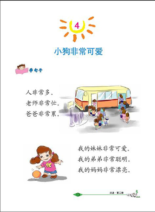 老师问学生:你家人多吗?你爸爸忙吗?你妹妹可爱吗?你弟弟聪明吗?你累吗?你有小狗吗?你的小狗聪明吗?你喜欢猫吗?你的小鸟好看吗?等等。当学生做出肯定回答后,提示学生用“非常”再说一遍,以巩固该句型。