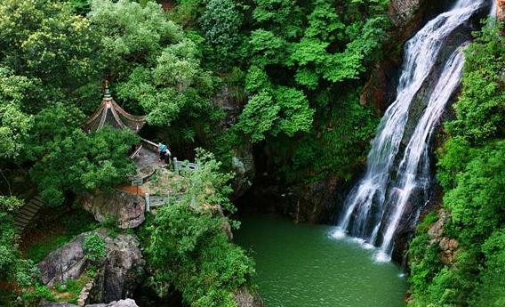梅雨潭是一个瀑布潭。仙岩有三个瀑布,梅雨瀑最低。走到山边,便听见哗哗哗的声音;抬起头,镶在两条湿湿的黑边儿里的,一带白而发亮的水便呈现于眼前了。