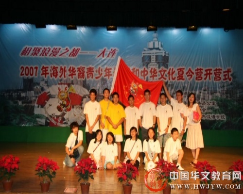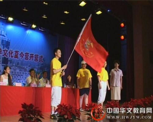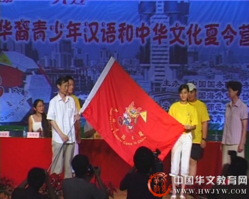 来自比利时、奥地利和日本的华裔营员接过营旗