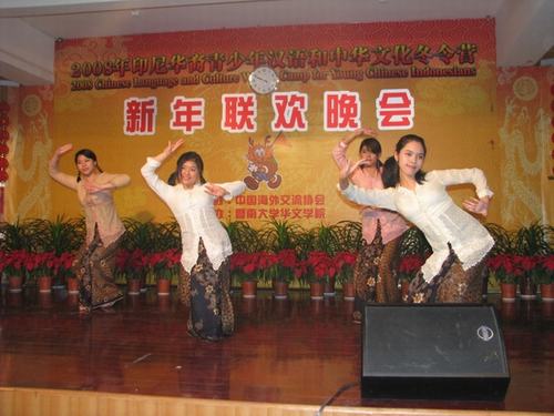 来自印尼雅加达馆区的营员们合唱了印尼国歌,他们活泼稚嫩的嗓音、可爱欢快的舞蹈赢得了在场观众的阵阵掌声;来自印尼各地的八位领队用中文深情演绎了“椰岛之歌”,并向大家致以新年的问候。华文学院学生献上婀娜多姿的印尼民族舞蹈、英姿飒爽的中国功夫;全体志愿者以一首精心准备的“广州欢迎你”,唱出了志愿者们和海外华裔青少年之间的珍贵情谊,唱出了暨南大学华文学院的热情。