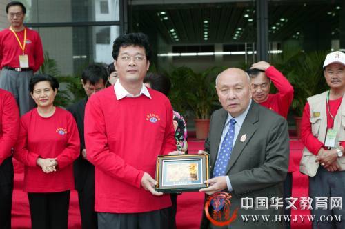 海南师范大学副校长温强向泰国海南会馆理事长冯裕德先生赠送纪念品
