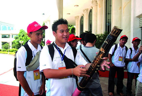 2008年海外华裔青少年中国寻根之旅夏令营(广东·顺德营)开营仪式在区政府会议中心举行。图为一名夏令营团员为大家展示家乡的乐器。 (珠江商报/王冰 摄) |