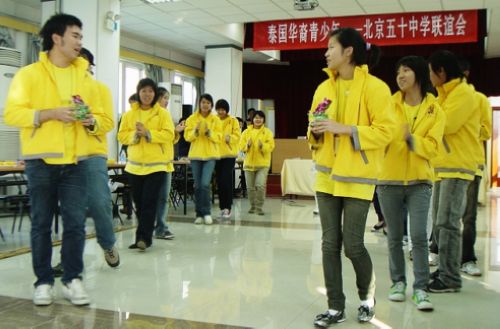 开营仪式结束后,泰国华裔青少年还与北京五十中学的学生们进行了联欢,北京五十中学的学生们表演了萨克斯独奏、快板书、独唱和民族舞蹈等,激起了营员们的浓厚兴趣;来自泰国的华裔青少年用中文合唱了“月亮代表我的心”,并热情地邀请北京的学生一起跳起了泰国的民族舞蹈水灯舞和竹竿舞。最后,两地学生还互赠了纪念品。