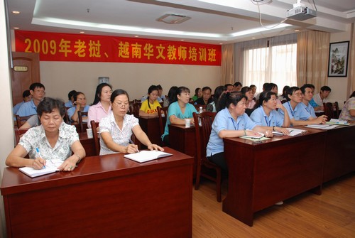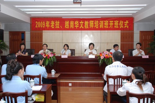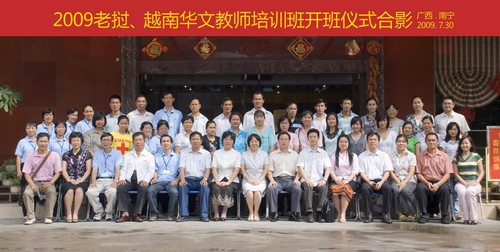由中国海外交流协会主办、广西海外交流协会和广西华侨学校承办的“2009老挝、越南华文教师培训班”于7月30日在绿城南宁举行开班仪式。来自老挝、越南12所不同的学校的35名学员将在南宁开展为期10天的汉语教学培训。中国海外交流协会文化部副部长汤翠英、广西海外交流协会副会长林容蓉、广西华侨学校校长甘武军、广西海外交流协会外联部部长林坤宁等领导出席开班仪式并致词。