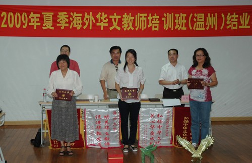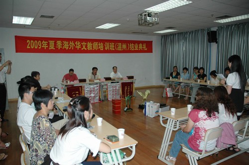8月15日下午,由国务院侨办主办,温州侨办、温州大学承办的“2009年夏季海外华文教师培训班”在温州圆满结束。温州市侨办主任陈永聪、温州市侨办副主任周顺来、温州大学国际合作学院院长严晓鹏出席了结业典礼,并向来自欧美等地区12个国家28所学校的35名华文教师颁发了结业证书。