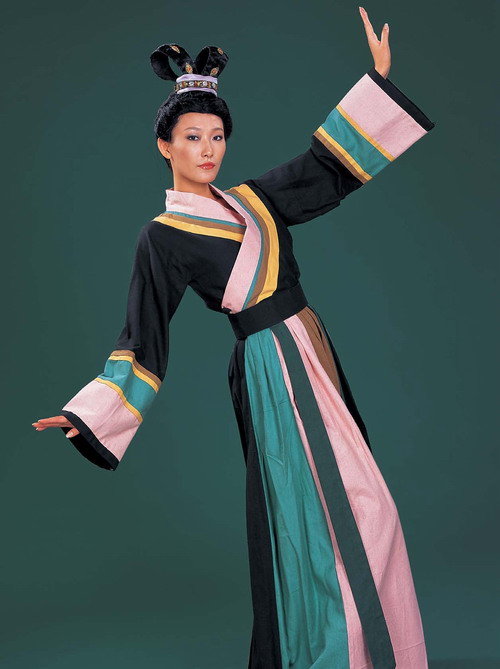 伦敦大英博物馆东晋顾恺之《女史箴图》之一,男穿曲领大袖长襦,女倭堕髻垂臂,右衽衫,长裙拂地,腰束细绅带。