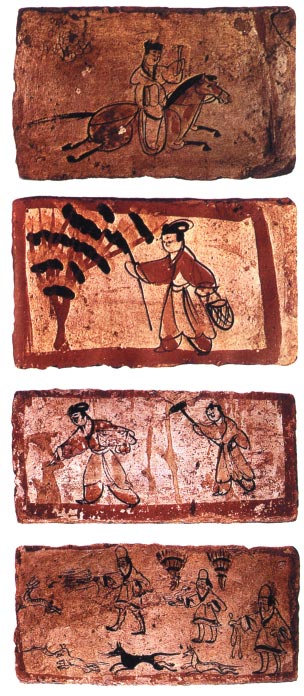 穿袍服的农民及农妇(甘肃嘉峪关出土砖画)、戴毡帽、穿袍服的猎人(甘肃嘉峪关出土砖画)