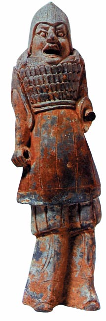 戴兜鍪、穿裆铠的武士(北魏加彩陶俑,传世实物,原件现在日本早稻田大学东洋美术陈列室)