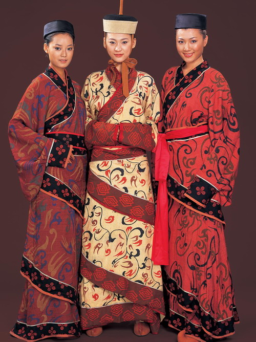 深衣是连体式的长衣服,它最大的特点是把左边的衣襟缝接出一片三角形,穿的时候,将它缠绕至背后,再用带子系住,这样做的目的是为了不显露出肌肤和尚不完善的内衣。深衣一般用柔软的材料制成, 再用挺括的锦缎材料缘边,使其既具有强烈的装饰效果,又持久耐穿。