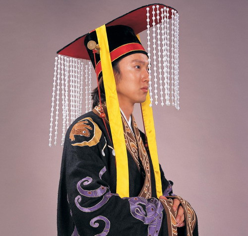戴卷筒式冠巾、穿华丽服装的贵族男子(河南安阳殷墟妇好墓出土玉人)