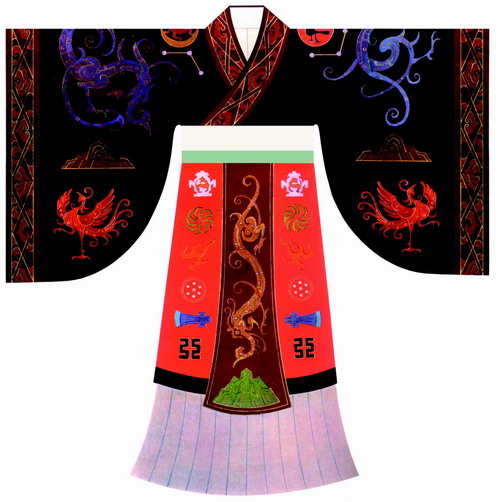 中国古代的帝王在祭祀时要穿华美的礼服——冕服。冕服由冕冠和礼服两部分组成,一般与腰带和赤舄(红色的鞋子)相配。其中,礼服又是由上衣和下裳(裙子)组成的。上衣采用青黑色,象征天;下裳黄赤色,象征地。上衣画有六种不同的纹样,而下裳则绣有六种不同的纹样,这些纹样合称十二章纹。