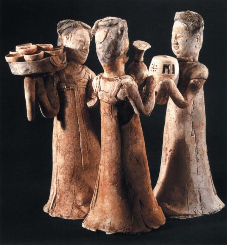 隋彩绘仆侍陶俑群,梳平云髻,小袖衫,高胸裙,河南博物院藏