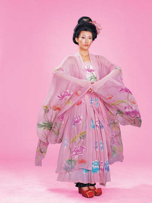 大袖衫是盛唐时候的女装,因为它的衣袖往往宽于1.3米,所以这种衣服被称为“大袖衫”。大袖衫一般用轻薄透明的纱料制成,上面还有精美的图案。女子穿上它,能显露出华贵而飘逸的气质。