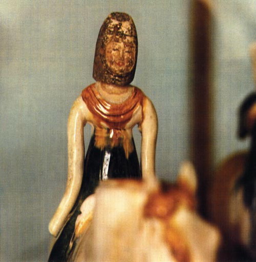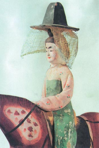 戴帷帽、穿襦裙的妇女(唐三彩俑,传世实物,原件现藏上海博物馆)
