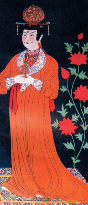 回鹘是中国西北地区的少数民族,回鹘女子的服装对唐代汉族女子的服装影响较大。回鹘女装的基本款是连衣长裙,翻折领、窄袖,衣身比较宽松,腰际束带。一般在翻领和袖口上都有凤衔折枝花的纹饰。女子在穿这种服装时要梳椎状的回鹘髻,上饰珠玉,簪钗双插,戴金凤冠,穿笏头履。