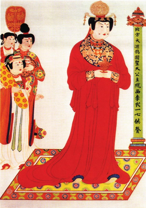 梳回鹘髻、戴金凤冠、穿回鹘装的晚唐贵妇(甘肃安西榆林窟壁画,张大千临摹)