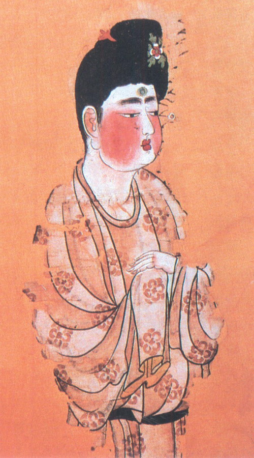 据说南北朝时有一位公主,一天在宫殿的屋檐下睡着了,一朵艳丽的梅花缓缓飘下,正落在她白皙的额头上,这眉间的梅花几天拂之不去,愈发显出公主的千娇百媚。一时间,宫女们争相仿效,纷纷用颜色在两眉间染绘出各种图案,甚至用金属片贴在眉间作装饰,这后来就成为盛行在唐代的化妆方式之一——花钿。