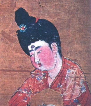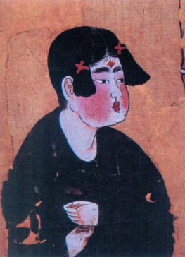 经过妆点的妇女唇式(新疆吐鲁番唐墓出土《弈棋仕女图》局部)
