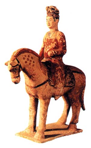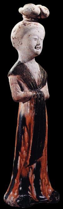 梳髻、穿翻领胡服的妇女(彩绘陶俑,原件现藏故宫博物院)