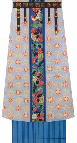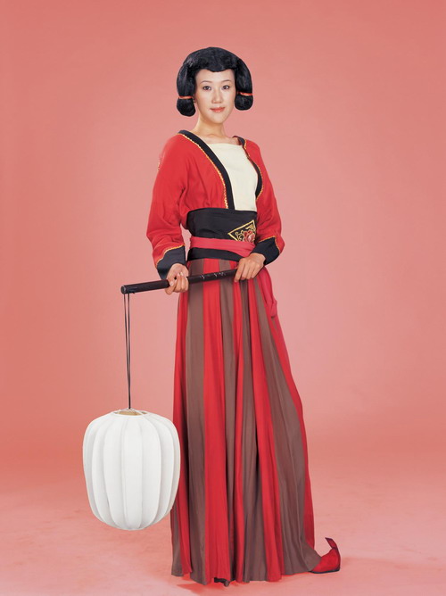 唐代的襦是一种衣身狭窄短小的夹衣或棉衣,领口和袖口有金彩纹绘或刺绣工艺,有的还镶有绫锦,这些装饰使服装的效果更加华美富丽。唐代的裙式大多高腰或束胸,款式贴臀,宽摆齐地,是下摆呈圆弧形的多褶斜裙。