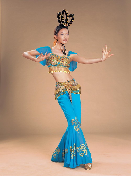 帔帛是一种长围巾,多以丝绸裁制,上面印画纹样,一般披在女子肩背上,花色和披戴方式很多。有的将其两端垂在手臂旁,一头垂得长些,一头垂得短些;有的将其右边一头束在裙子系带上,左边一头由前胸绕过肩背,搭着左臂下垂,还有的将其两端棒在胸前……帔帛会随女子行动时而飘舞,非常优美。