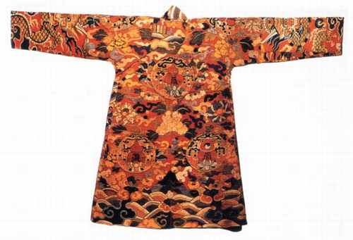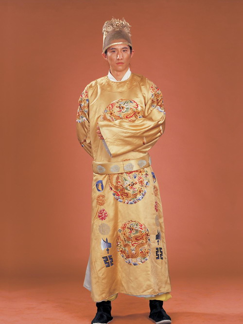 明代皇帝的日常服装是龙袍,上面绣着龙纹、翟纹和十二章纹,一般以黄色纱罗制成,配金冠。皇帝礼服则仍保持上衣下裳的古制,由玄衣、纁裳、白罗大带、黄蔽膝、素纱中单、赤舄等组成。玄衣肩部织日、月、龙纹,背部织星辰、山纹,袖部织火、华虫、宗彝纹,领、袖口、衣襟侧边、裾都是本色。纁裳织藻、粉米、黻、黼纹。