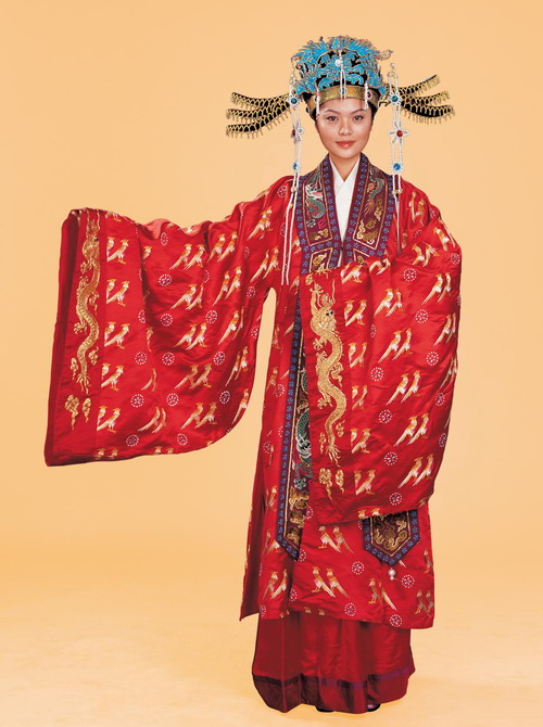 皇后在受册、朝会时穿礼服。礼服由凤冠、霞帔、翟衣、背子和大袖衫组成。凤冠上饰有龙凤和珠宝流苏,配玉革带,青色加金饰的袜、舄。皇后的常服是穿金绣龙纹的红色大袖衫、霞帔、红色长裙、红背子,配凤冠。