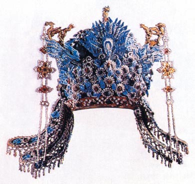 明代凤冠以金、银、铜等金属丝网为胎,衬以罗纱,并挂有珠宝流苏,它有两种基本形式:一种是后妃所戴的礼冠,上缀点翠凤凰、龙等装饰,龙凤嘴中常衔着珠花,下垂至肩;另一种是普通命妇所戴的彩冠,上面不缀龙凤,仅缀珠翟、花钗等,但习惯上也称它为凤冠。