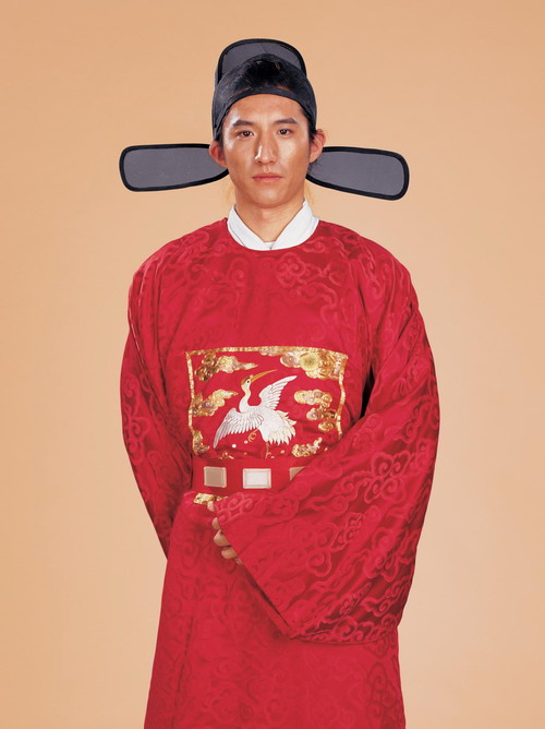 明代文武官员一律穿盘领右衽、袖宽三尺的袍衫,在重要礼仪场合,不论职位高低,都戴梁冠,穿赤罗衣裳,以冠上梁数及所佩绶带分别等差。在日常服装中,都带乌纱帽或幞头,并在前胸和后背缀以一方补子,文官用禽、武官用兽作装饰。官服的颜色、质地、式样、花纹图案以及尺寸因级别而异,都有明确的规定。
