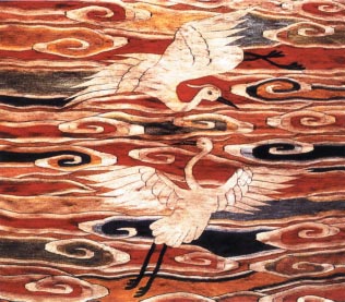 人们常将几种不同形状的图案配合在一起,或取其寓意,或取其谐音,以此寄托美好的愿望,或抒发自己的感情。这些富有浓厚民族色彩的传统图案被称为“吉祥图案”,在明代的织物上体现得非常充分:如“福从天来”“金玉满堂”“连年有余”“八吉祥”等等。尽管这些图案的形状各不相同,结构也比较复杂,但在一幅画面上,被组织得相当和谐,常在主体纹样中穿插一些云纹、枝叶或飘带,给人以轻松活泼的感觉。