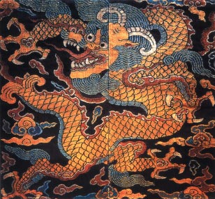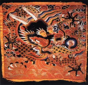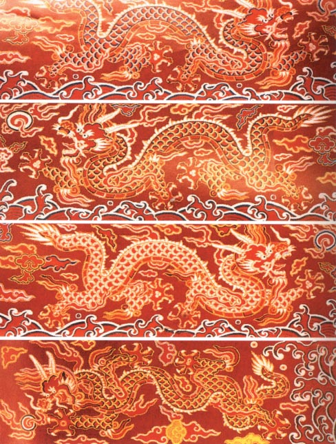 北京定陵出土明万历皇帝织金妆花纱柿蒂形过肩龙阑(复制件,北京定陵博物馆藏)