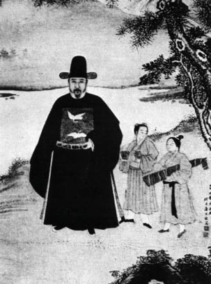 戴乌纱帽、穿盘领补服的明朝官吏(明人《沈度写真像》)